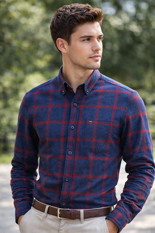 Long Sleeve 100% Pure Cotton Plaid Shirt – Navy & Red